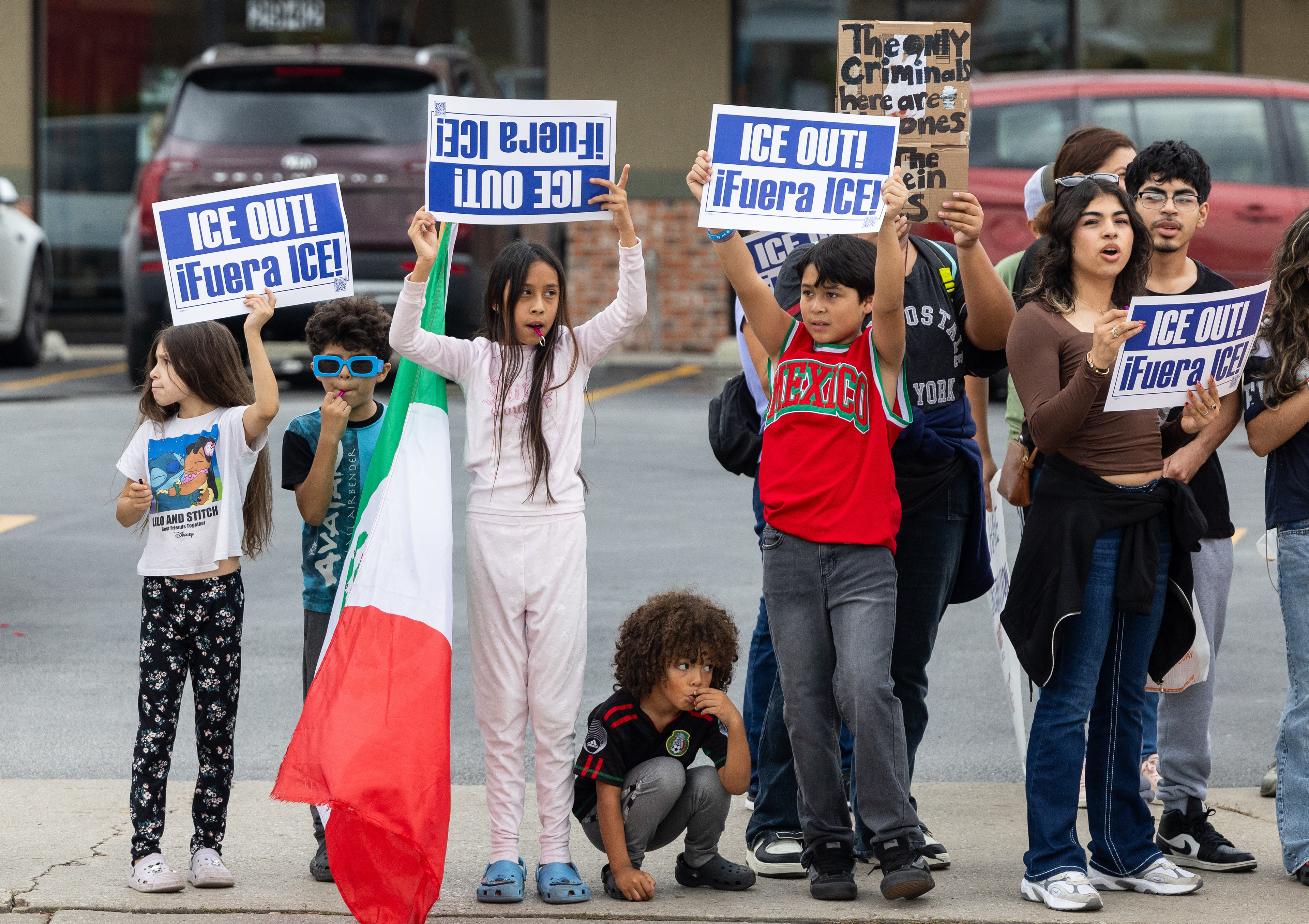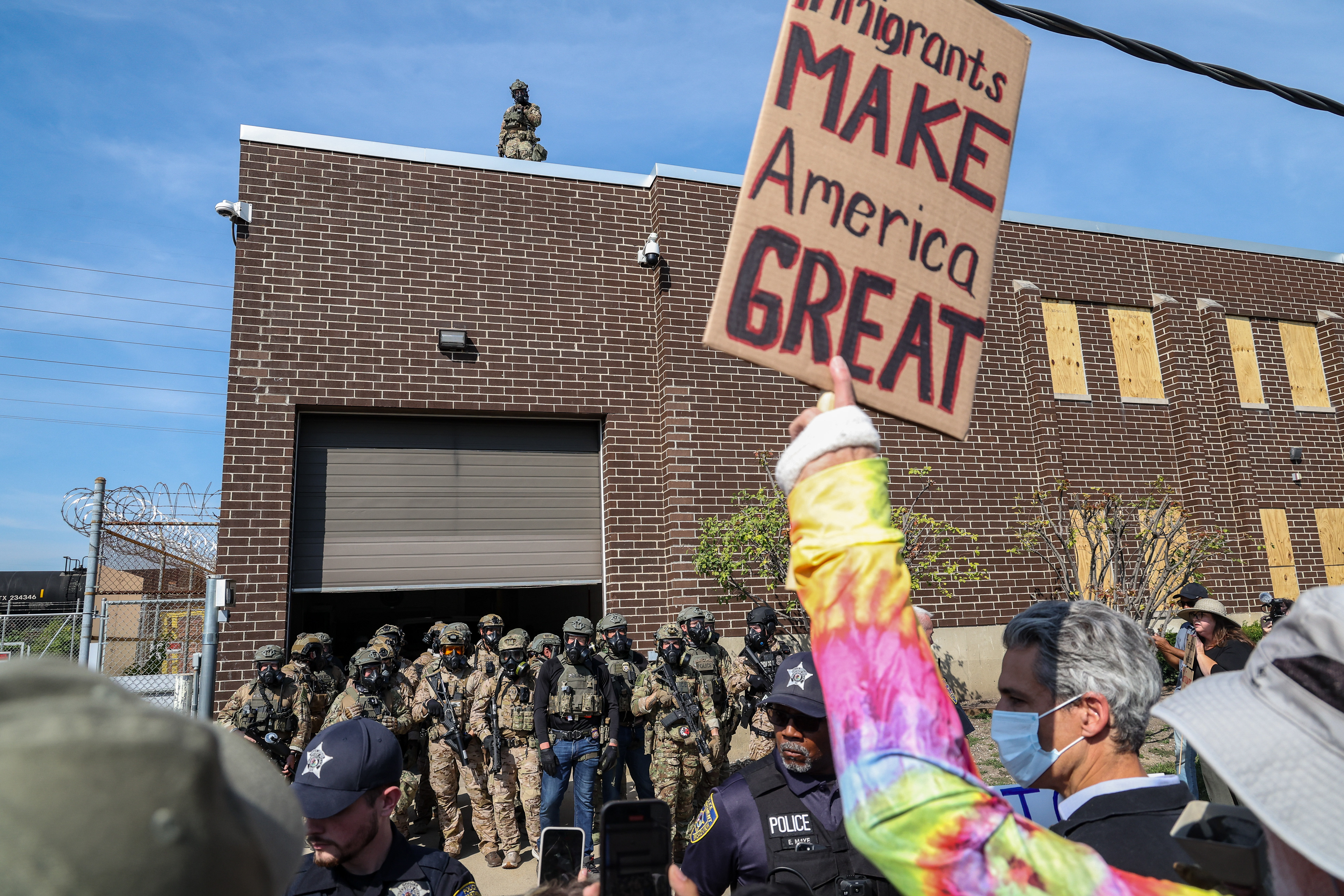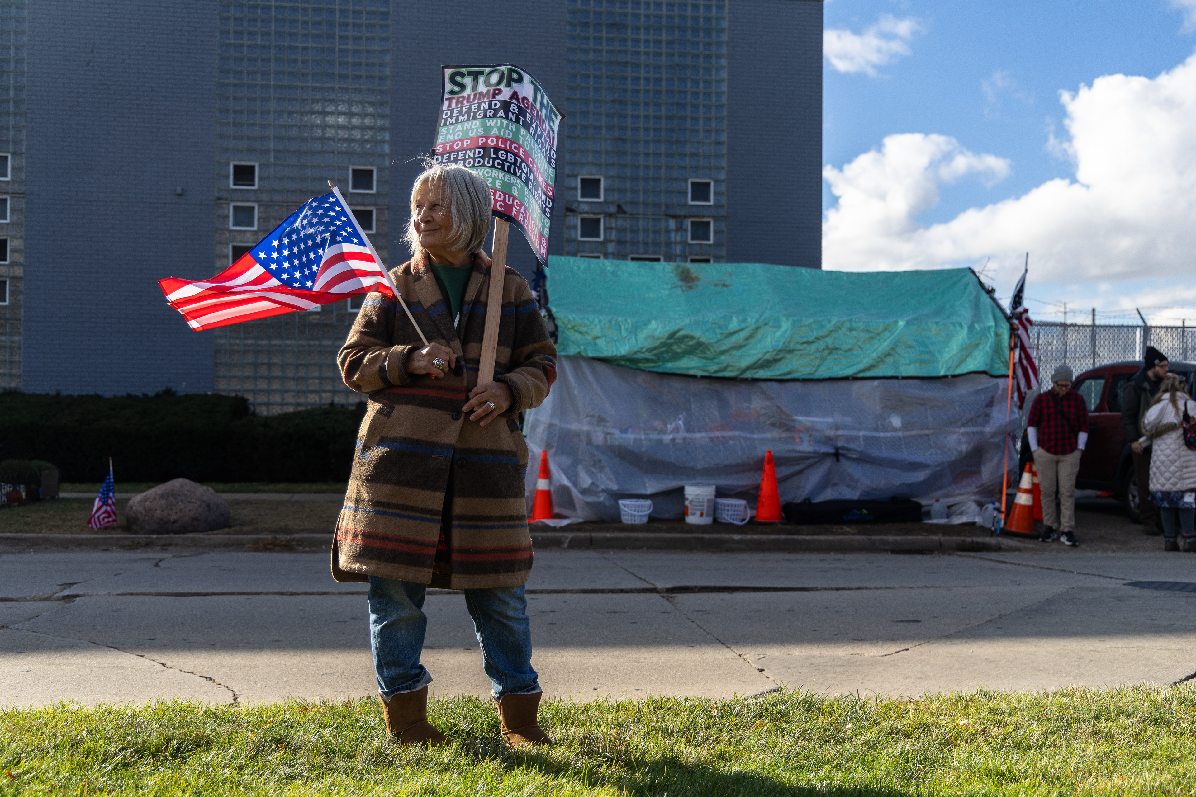 A protester and Iraq veteran flies the American flag upside down during a protest at the Immigration and Customs Enforcement facility in Broadview, Illinois on Saturday, Sept. 27, 2025.