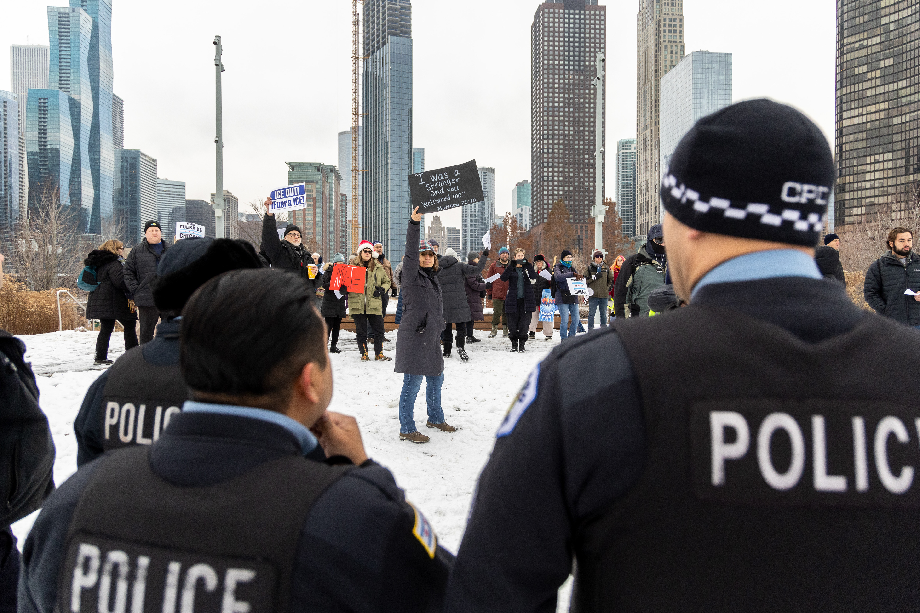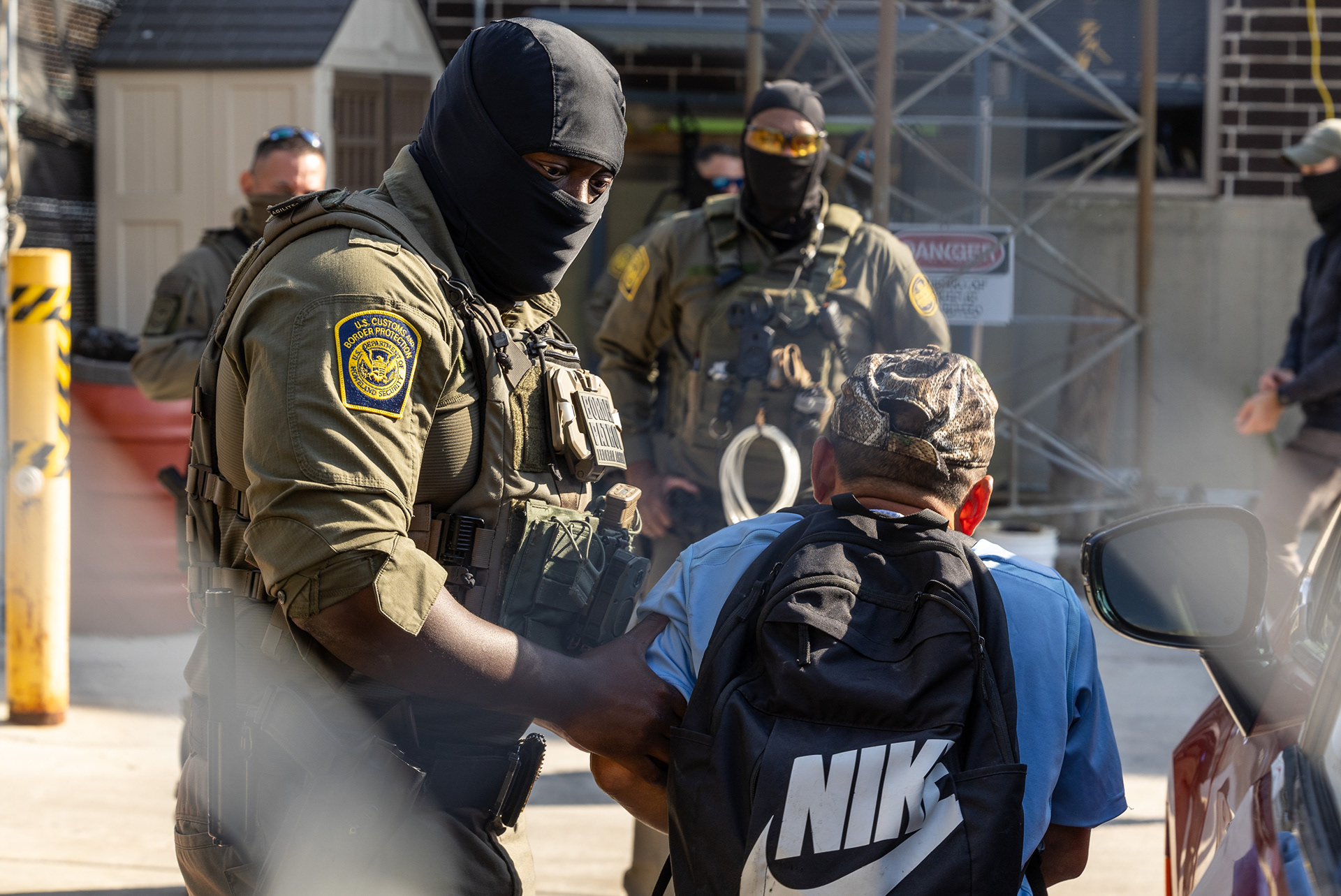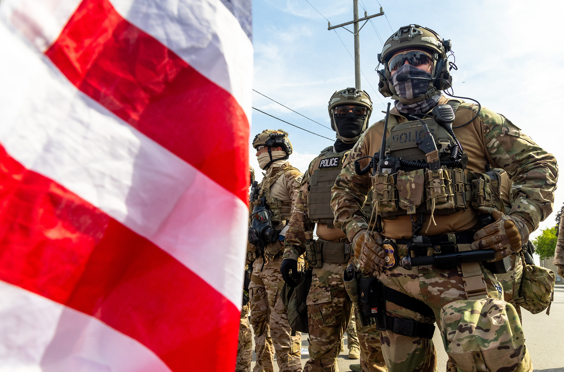 A protester and Iraq veteran flies the American flag upside down during a protest at the Immigration and Customs Enforcement facility in Broadview, Illinois on Saturday, Sept. 27, 2025.