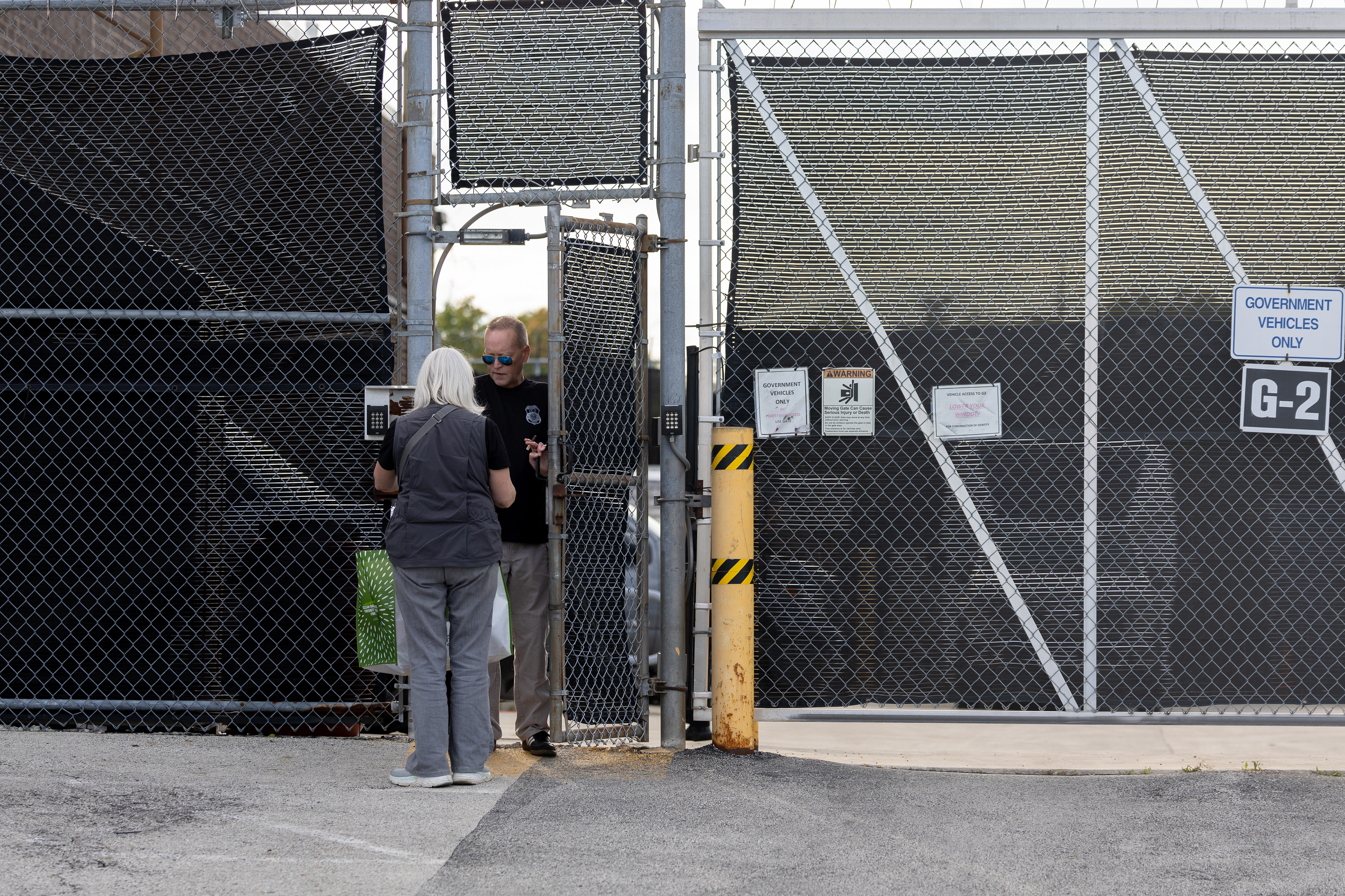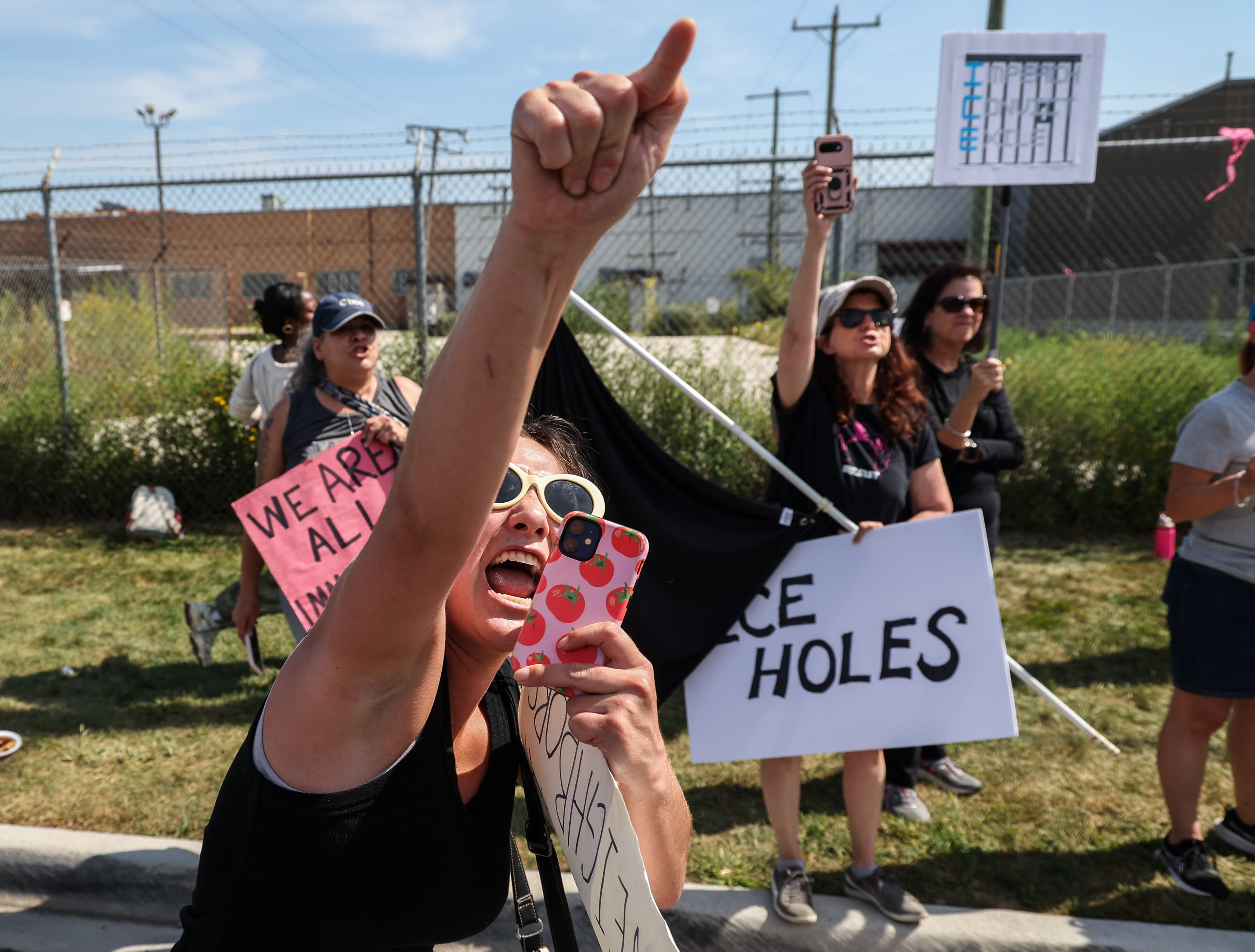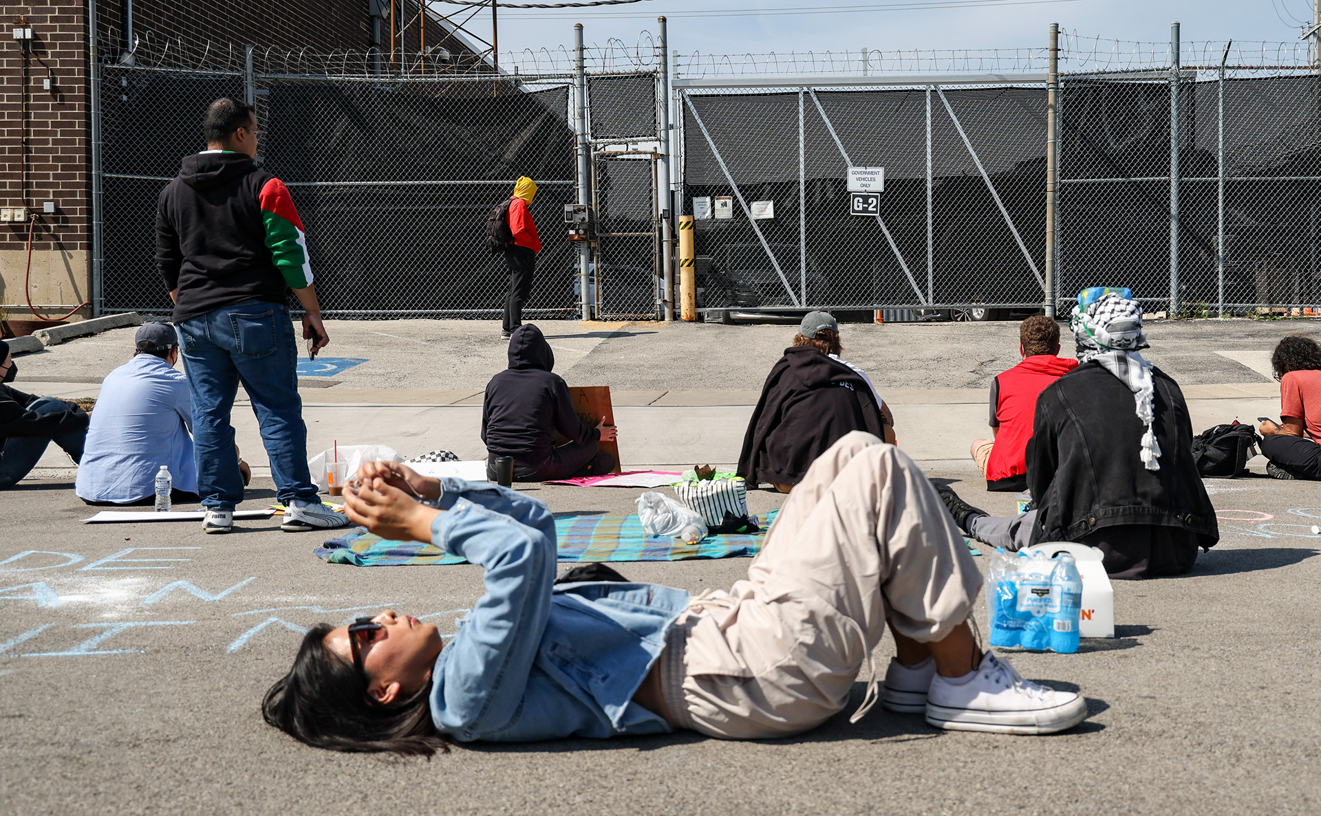 A protester wipes his eyes after being sprayed with a substance by a federal agent through a fence at the Immigration and Customs Enforcement facility in Broadview, Illinois on Saturday, Sept. 27, 2025.