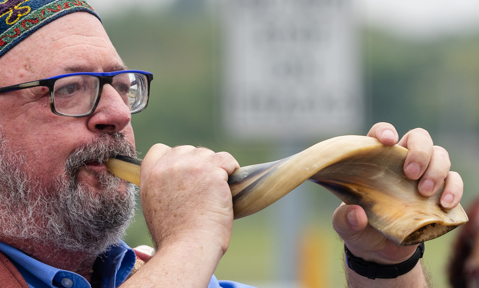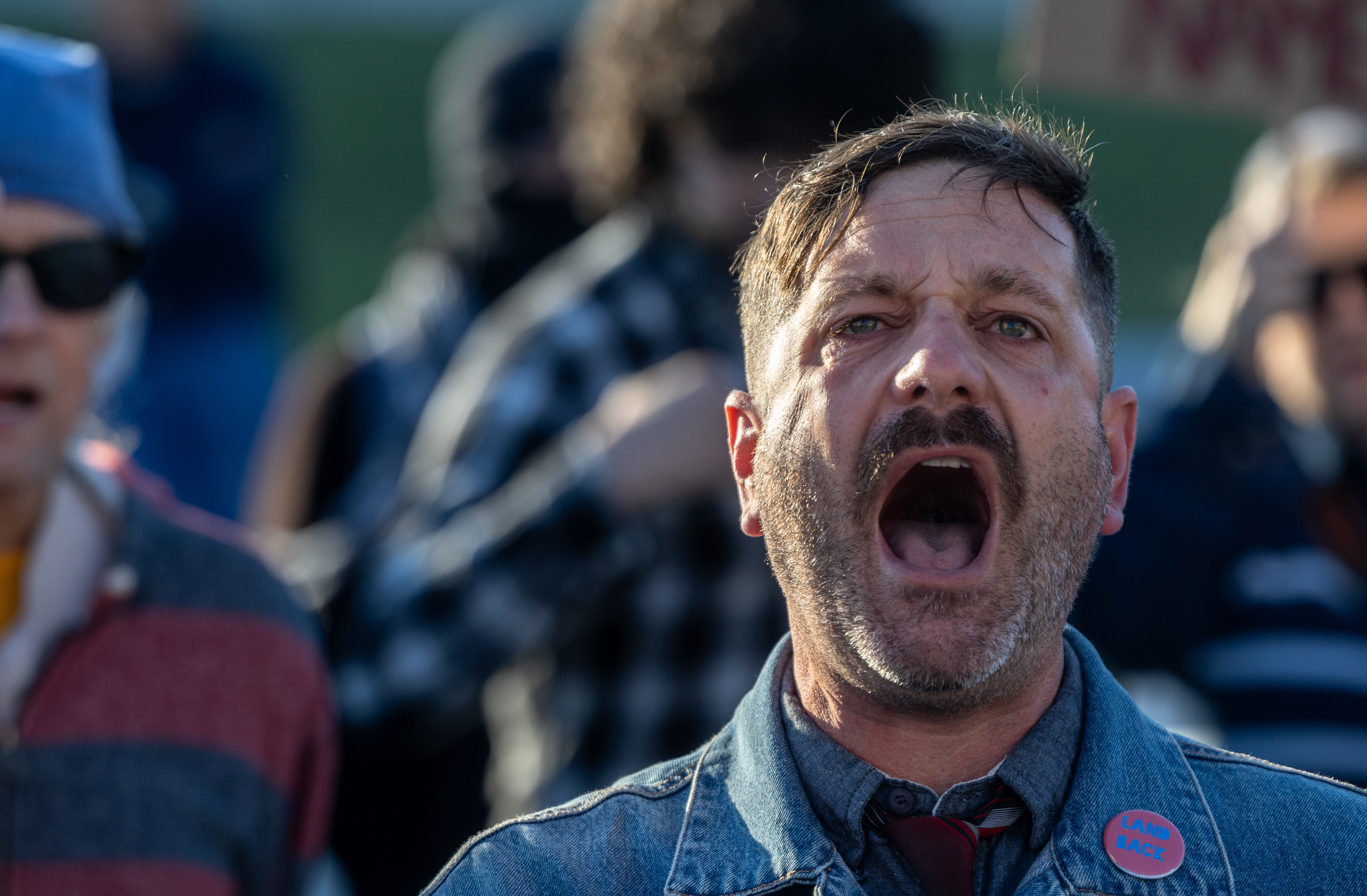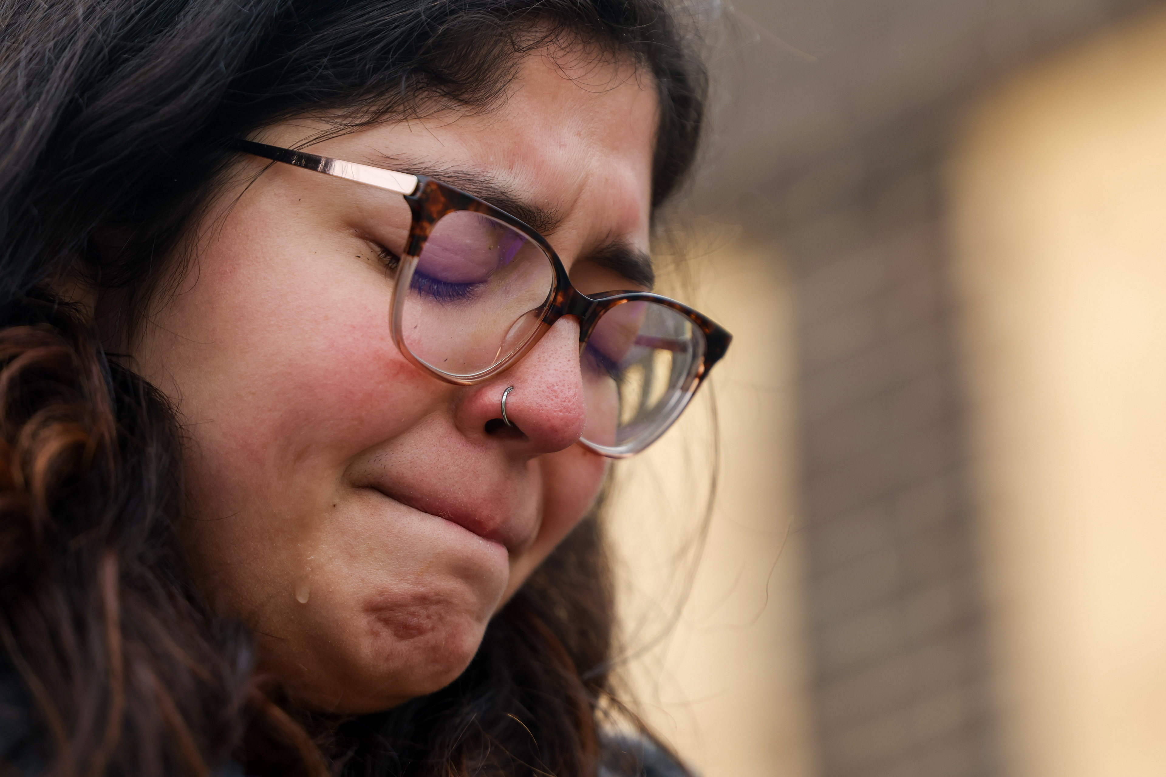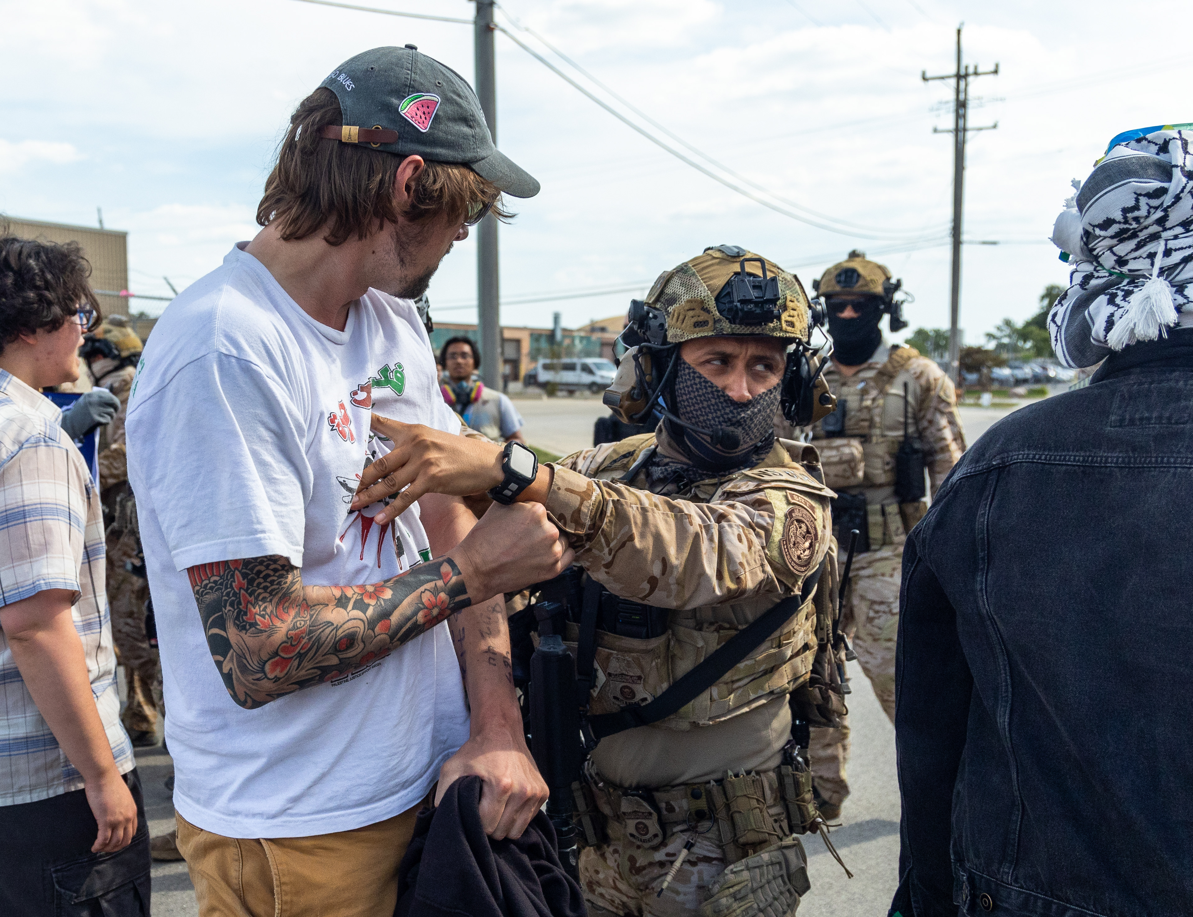 A protester wipes his eyes after being sprayed with a substance by a federal agent through a fence at the Immigration and Customs Enforcement facility in Broadview, Illinois on Saturday, Sept. 27, 2025.
