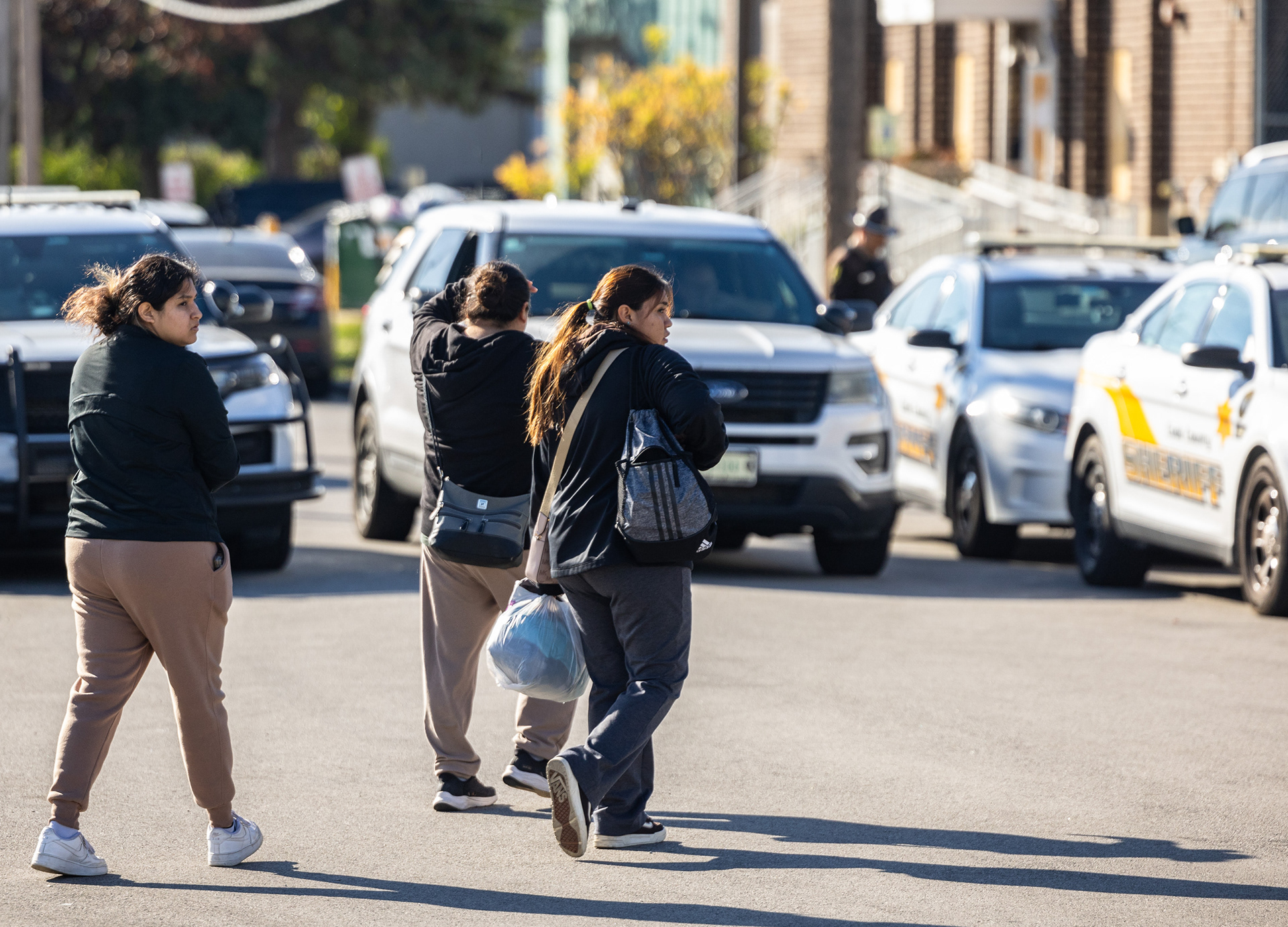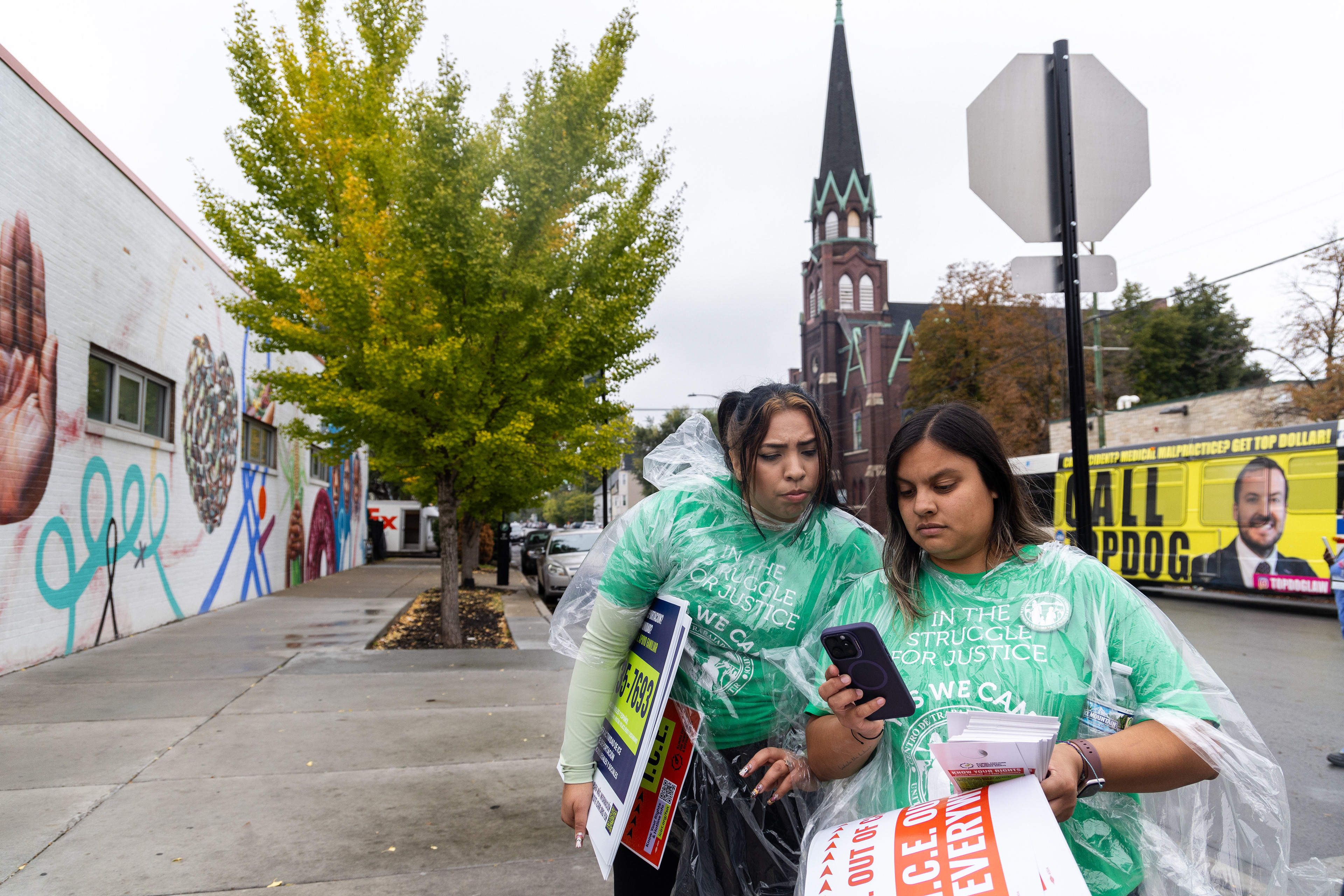 Vivianna Yepez, left, and Karina Frasco, both with United Workers’ Center, check out an alleged Immigrations and Customs Enforcement sighting tip they received while canvassing to businesses about their rights regarding ICE, Wednesday, Oct. 15, 2025, on Commercial Drive in South Chicago. No federal agents were seen.