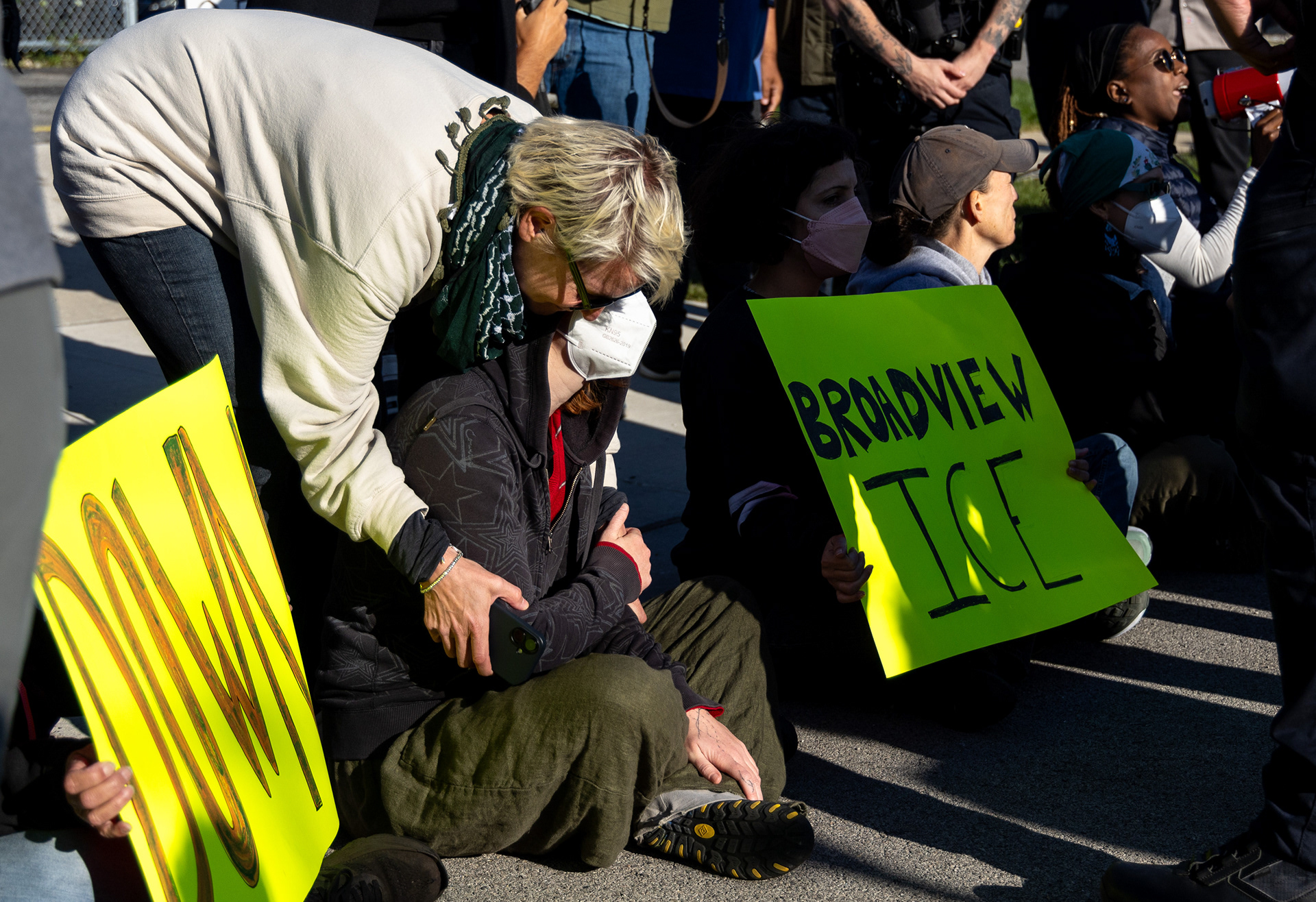 A protester gets treated after being sprayed by a federal agent through a fence at the Immigration and Customs Enforcement facility in Broadview, Illinois after being sprayed by a federal agent through the fence on Saturday, Sept. 27, 2025.